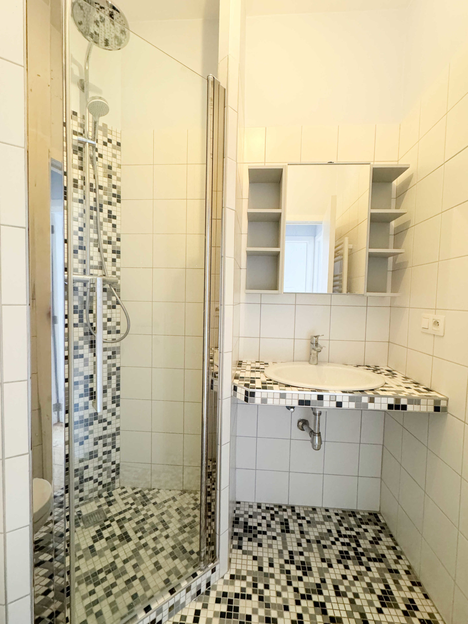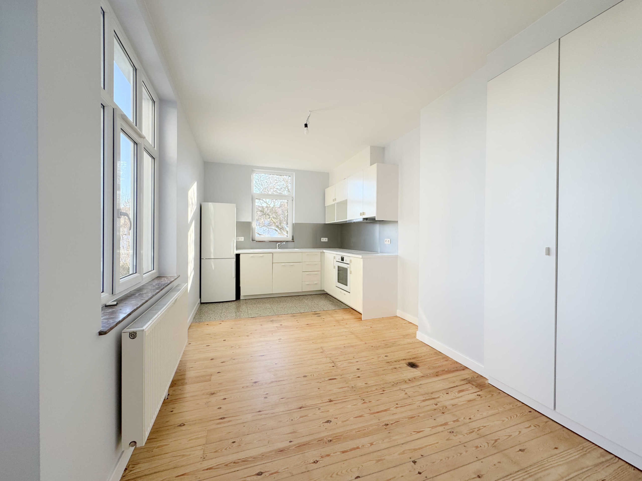 L’appartement se compose comme suit : Séjour, salle à manger, terrasse, cuisine full équipée (four, taque, hotte, frigo/congélateur), hall de nuit, salle de douche, deux chambres.