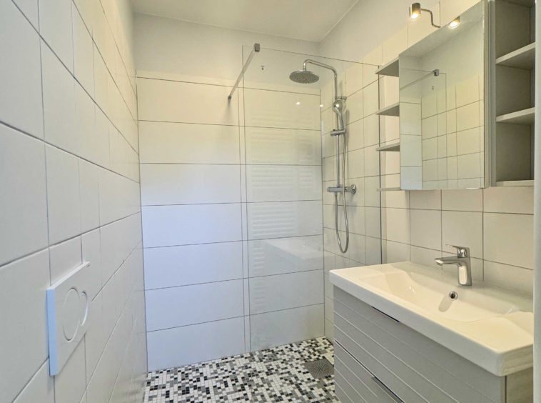 L’appartement se compose comme suit : Séjour, cuisine full équipée, deux chambres, salle de douche, terrasse, jardin orienté SUD, cabane de jardin et une cave.