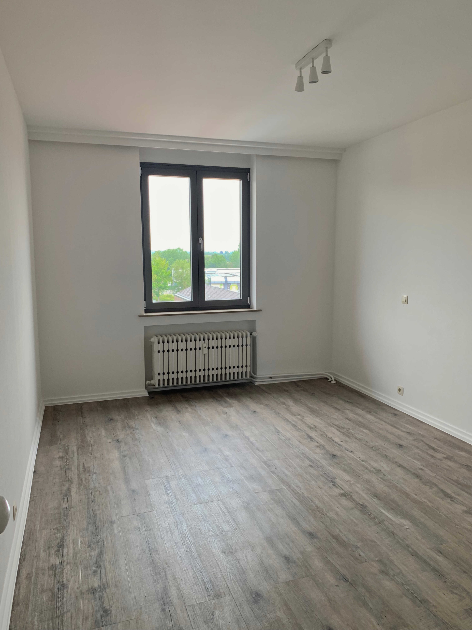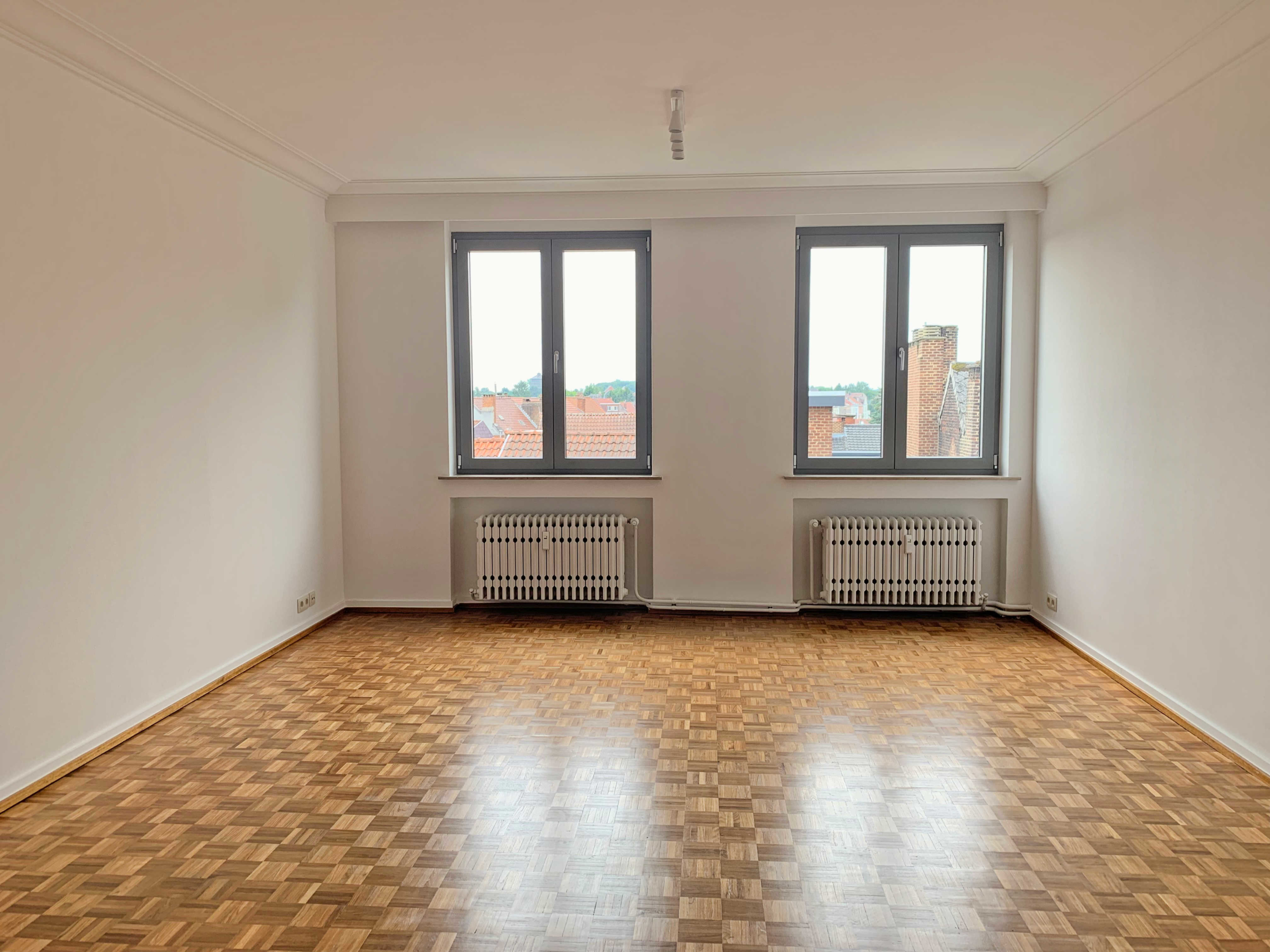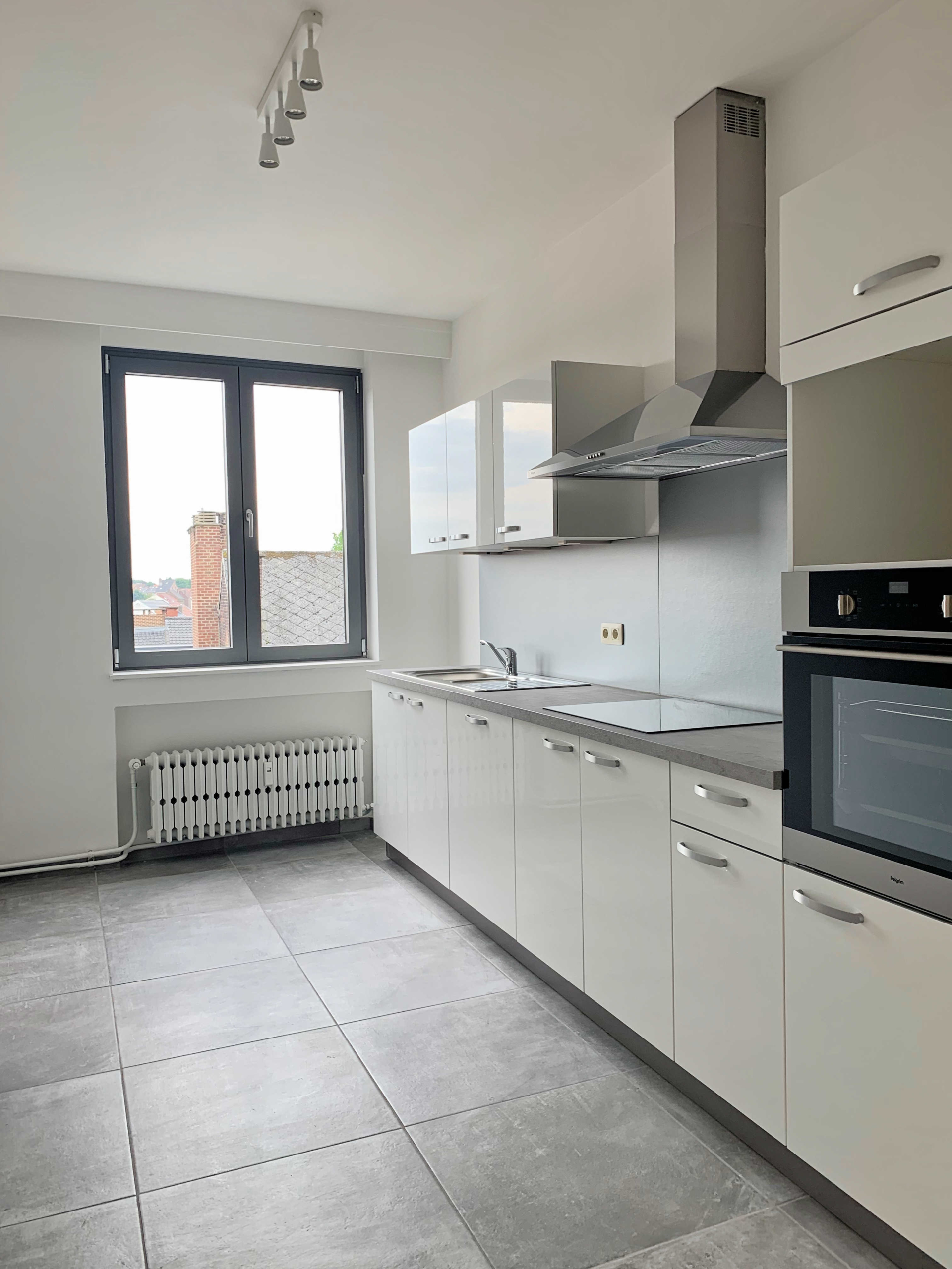 L’appartement comprend : Hall d’entrée, cuisine équipée (four, taque, hotte, lave-vaisselle), salon/living, hall de nuit, débarras, salle de bains/douche avec emplacement pour machine à laver, 2 chambres, une terrasse (vue arrière) et une cave.