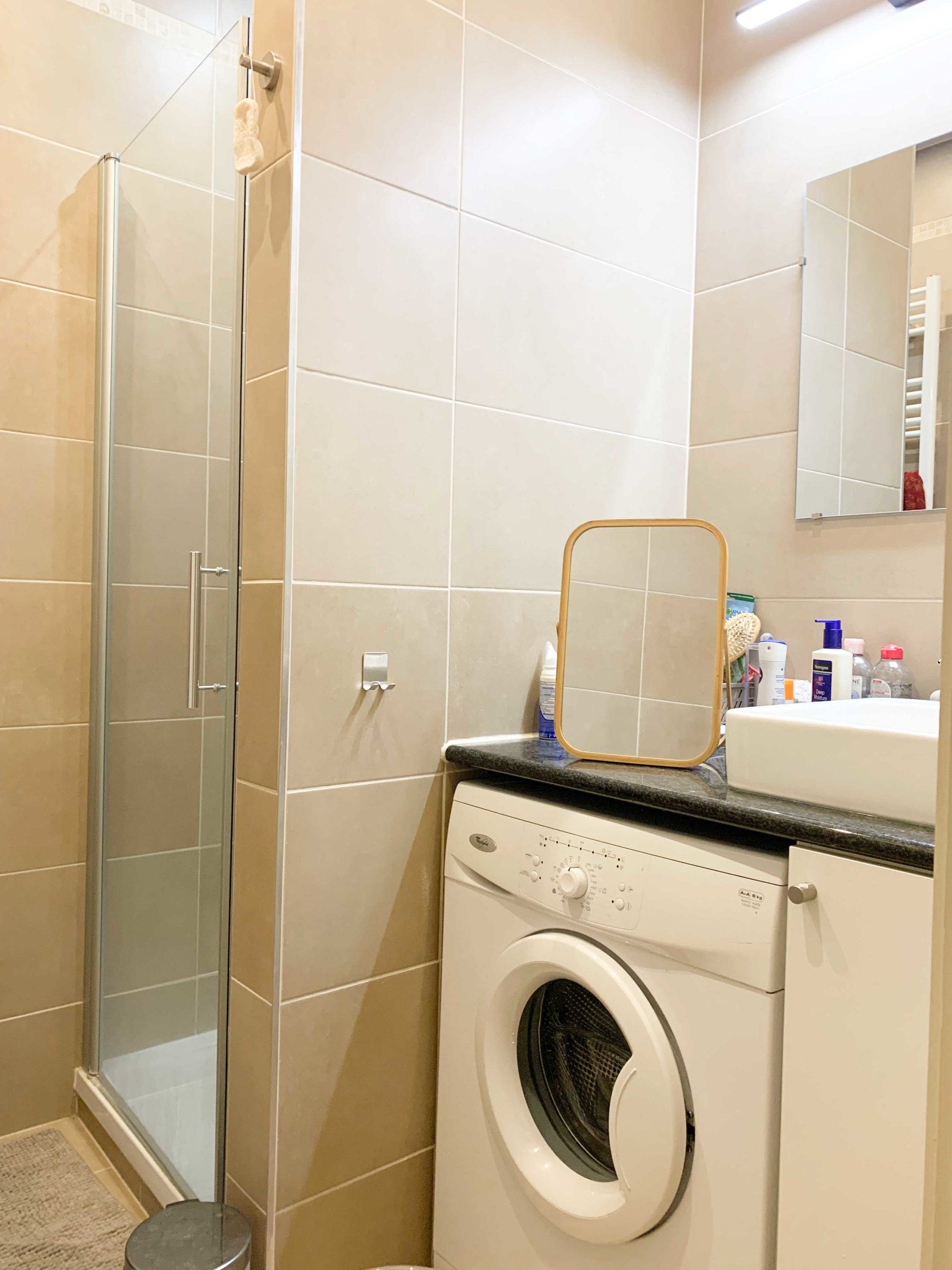 L’appartement comprend : Entrée, séjour, balcon, cuisine équipée (four, taque, hotte), hall de nuit, salle de douche avec emplacement machine à laver, une grande chambre et un espace bureau.