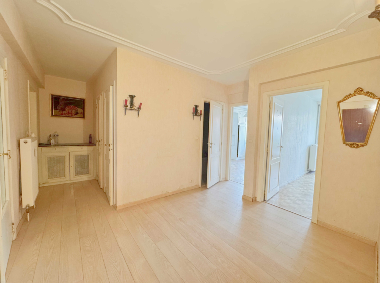 🔹 Spacieux séjour lumineux avec grande armoire murale dissimulant l’accès à la cuisine équipée