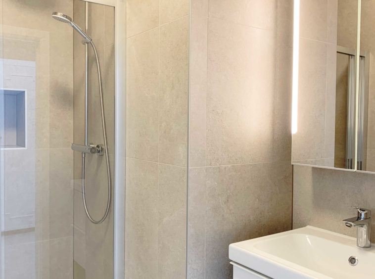 Au niveau supérieur : Hall de nuit avec rangements, Buanderie, Grande Chambre parentale (+/-18m2) avec rangements, salle de bain/douche privative et son balcon, les deux autres chambres (+/-13m2,12m2) et une salle de douche.