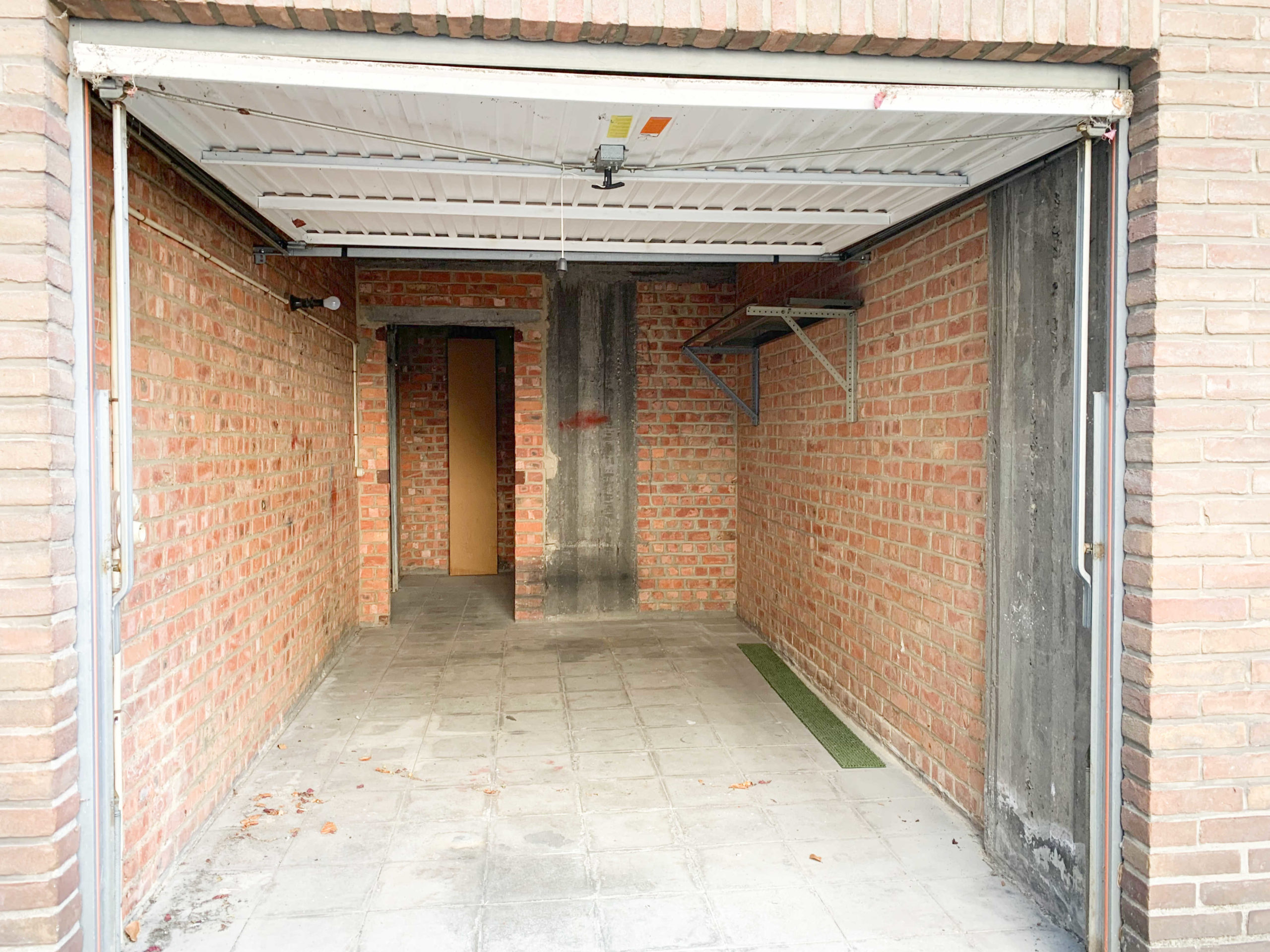 Le garage n°8 comprend : une porte manuel à ouverture à clé, un espace voiture et un espace pour du rangement (vélo,…) au fond du garage. L’accès à rue se fait par une porte sectionnelle électrique avec télécommande.
