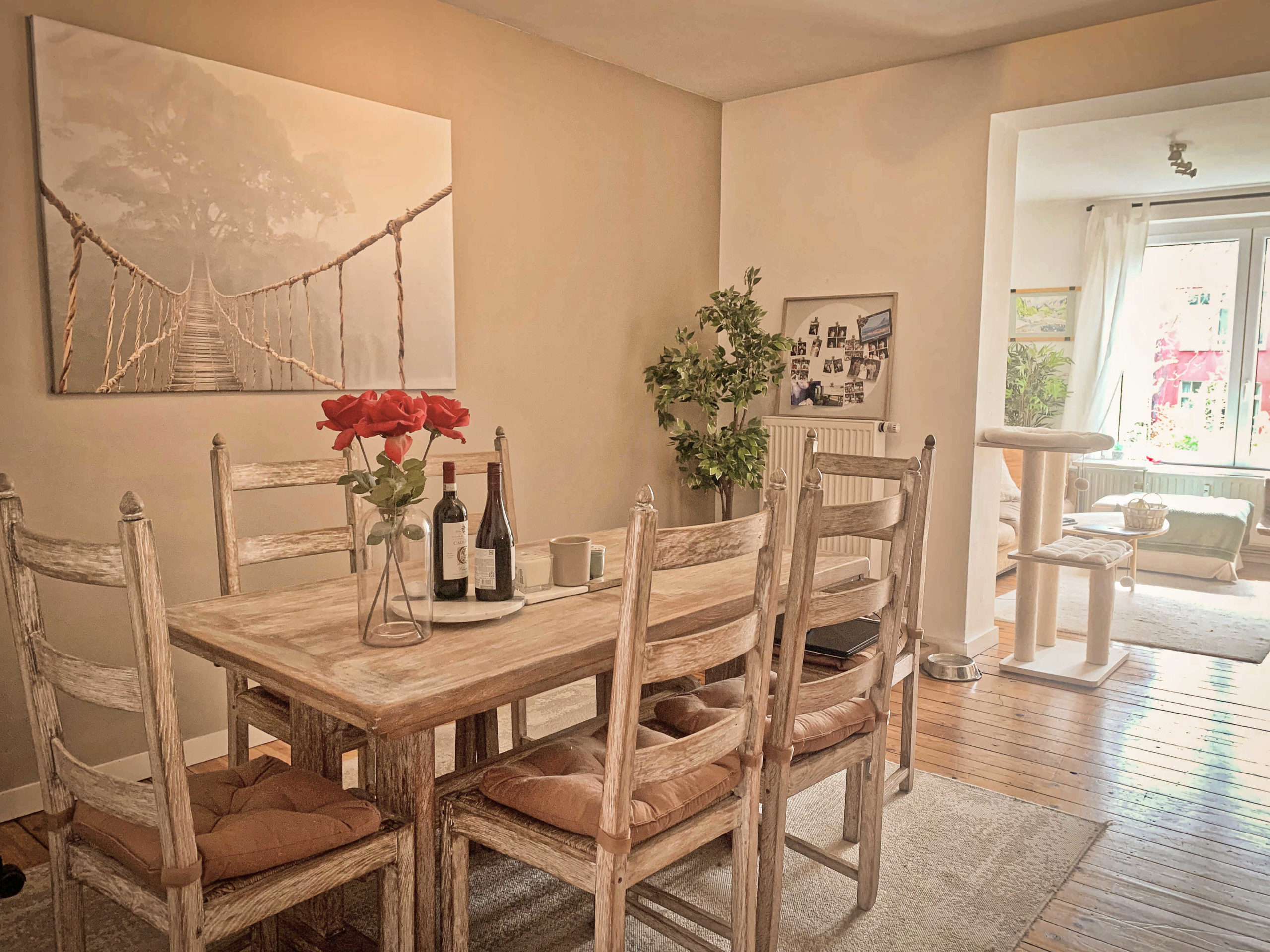 L’appartement se compose comme suit : Séjour, salle à manger, une cuisine semi-équipée (taque, hotte, armoire), une chambre et une salle de bain.