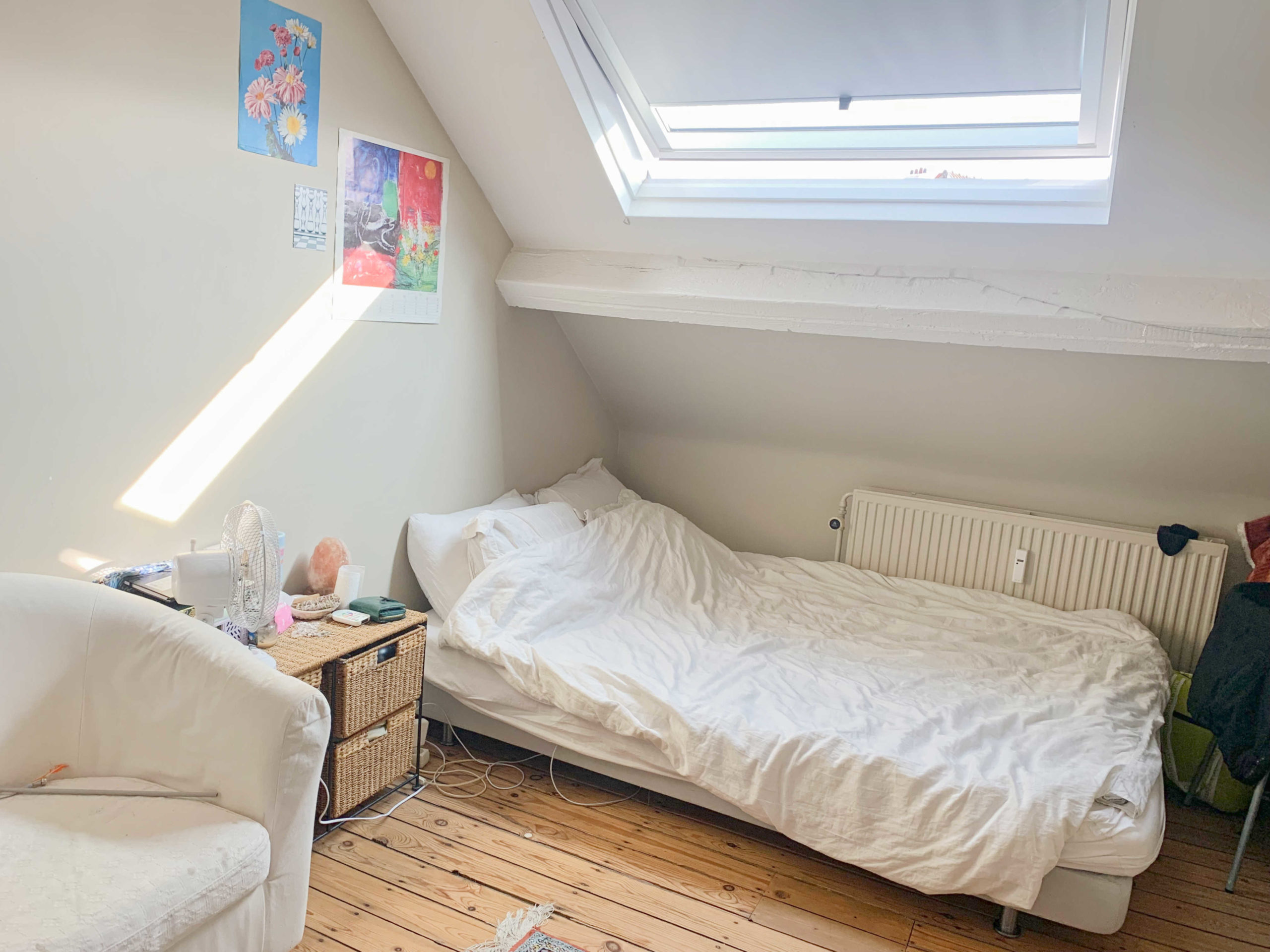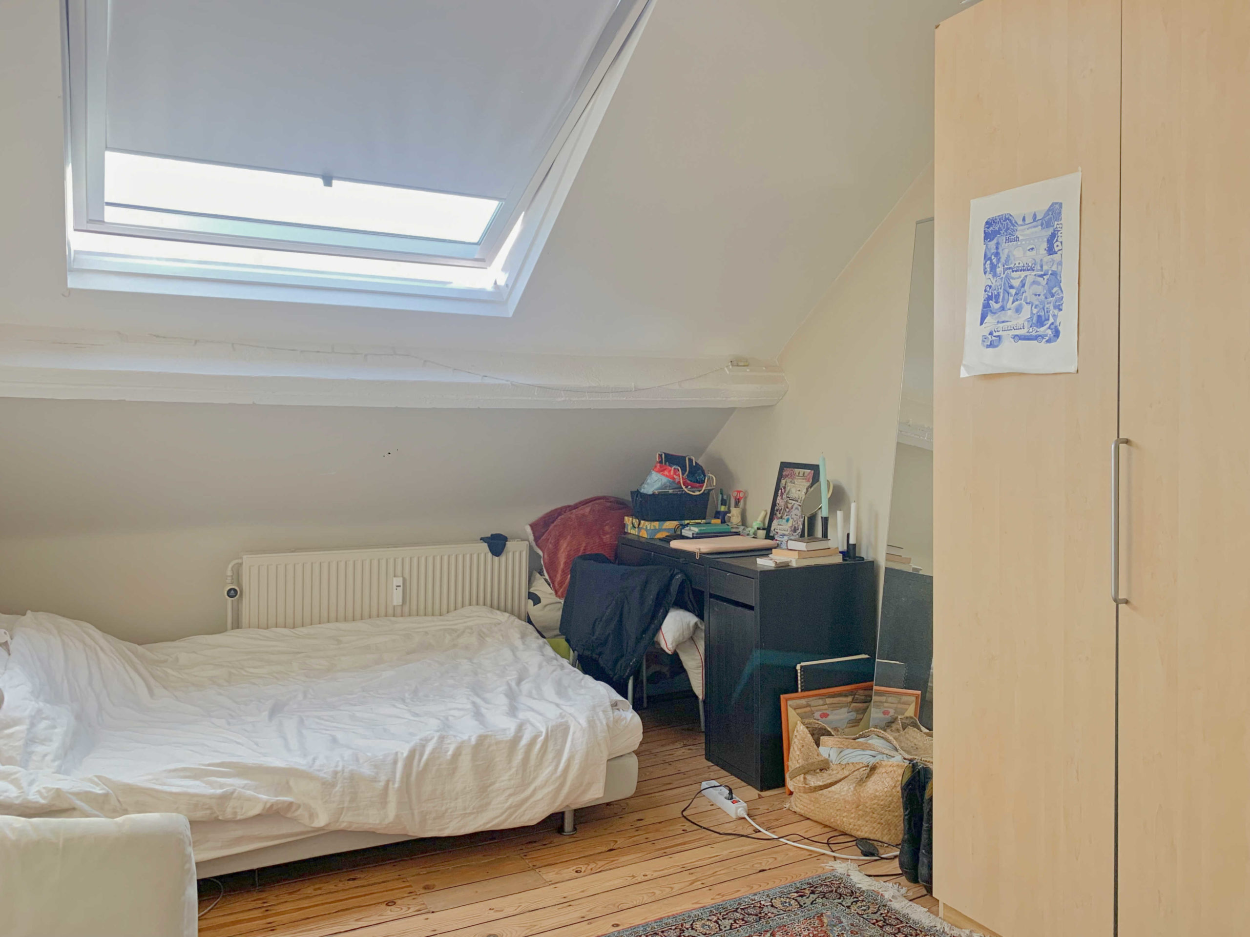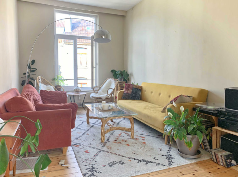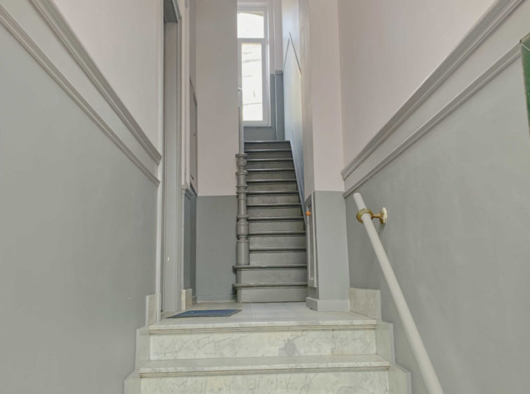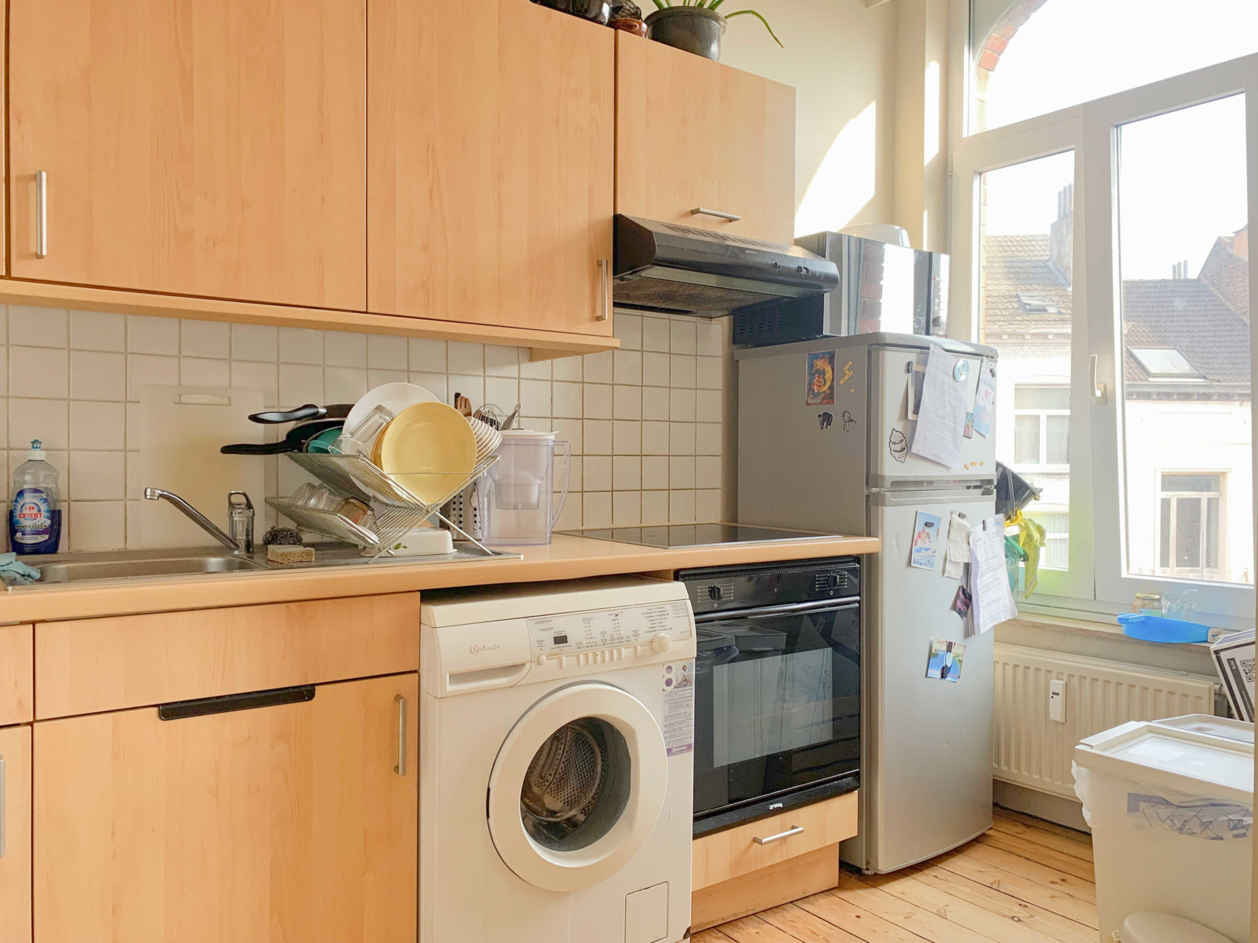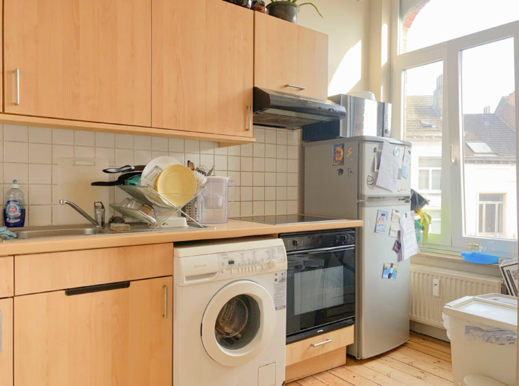 L’appartement « duplex » au 2ème et 3ème étage se compose comme suit : un hall d’entrée, un salon, une salle à manger, une cuisine (taque, four, hotte, emplacement pour un frigo et une machine), à l’étage: une salle de bain et deux chambres.