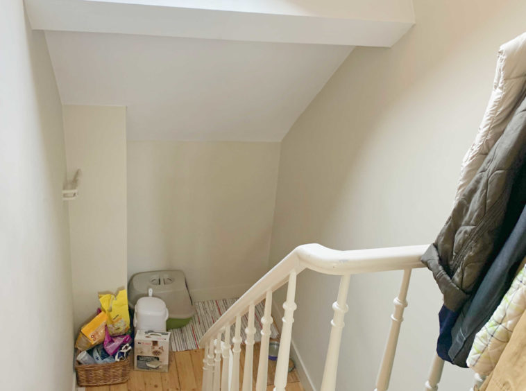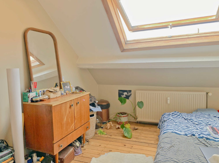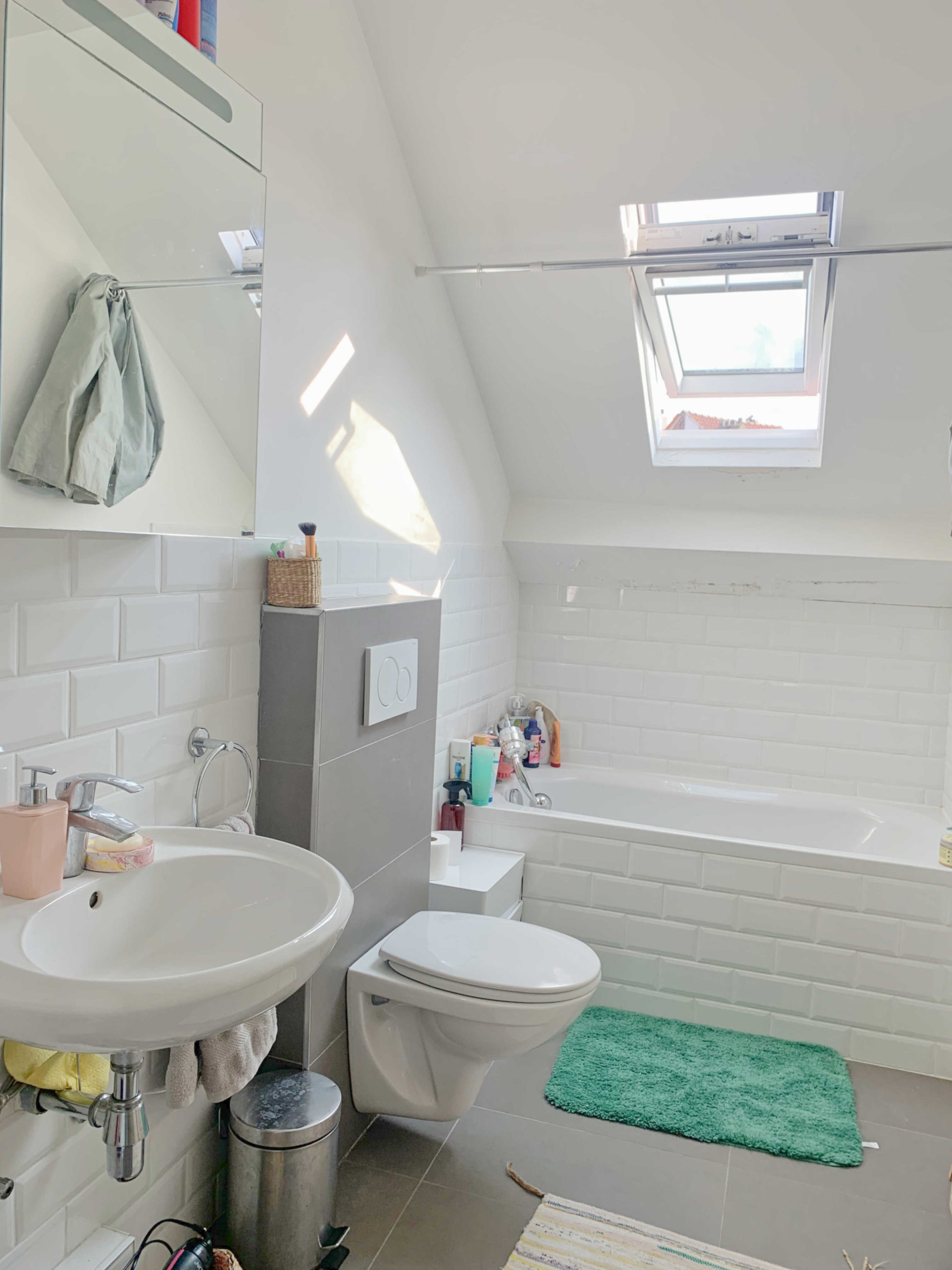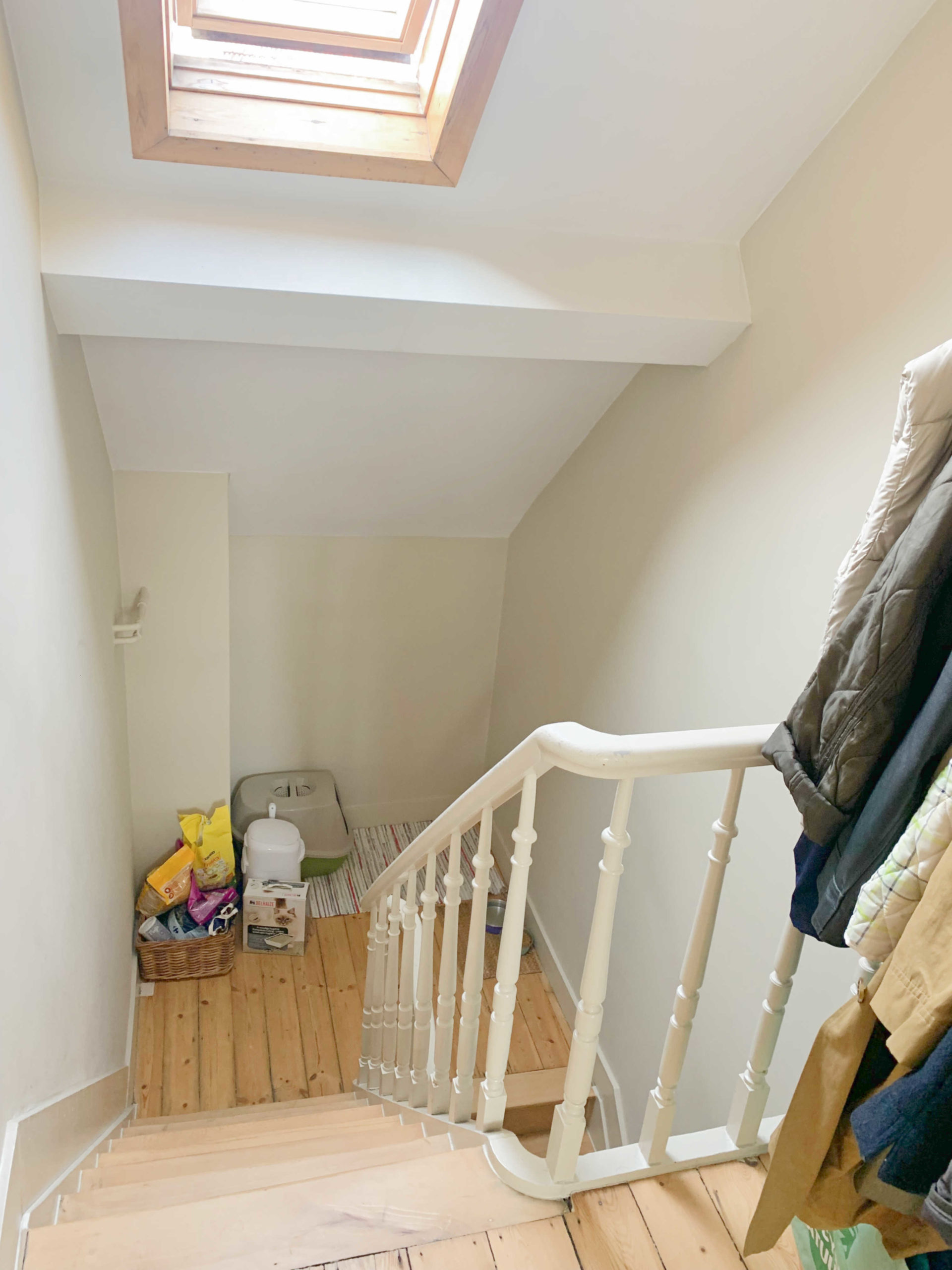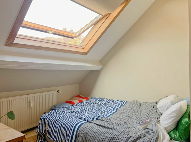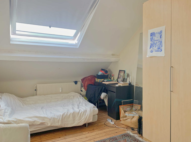 L’appartement « duplex » au 2ème et 3ème étage se compose comme suit : un hall d’entrée, un salon, une salle à manger, une cuisine (taque, four, hotte, emplacement pour un frigo et une machine), à l’étage: une salle de bain et deux chambres.